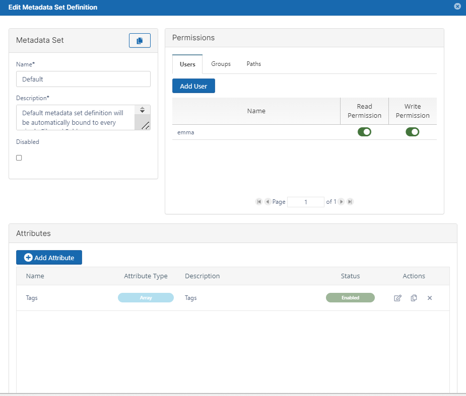 - Exactly one Default Set exists in FileCloud - it cannot be deleted, but administrators can customize attributes and permissions or disable it.