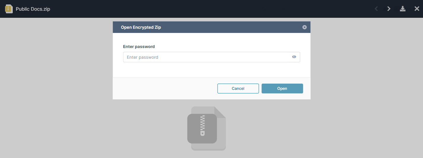 If the zip file is password-protected and you have not accessed it yet during this login session, you are prompted to enter the password. When you access it again during this session, you will not be prompted to enter your password (unless this option has been disabled).