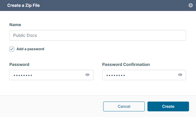 To create zip files in FileCloud as Zero Trust, you can add a password that must be entered by you or anyone you share the zip file with to access it. By default, after the password is entered the first time during a log-in session, it does not have to be entered again during that session. However, your administrator may disable this option.