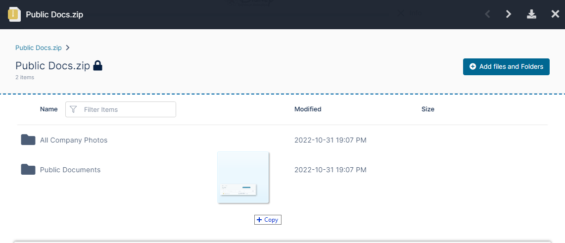You can preview, download, add, and delete contents of a zip file that you add or upload. Note that you cannot upload zip files of more than 4 GB into FileCloud, and zip files that you create in FileCloud must be less than 100 MB.