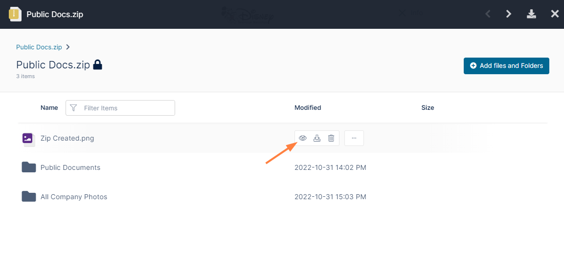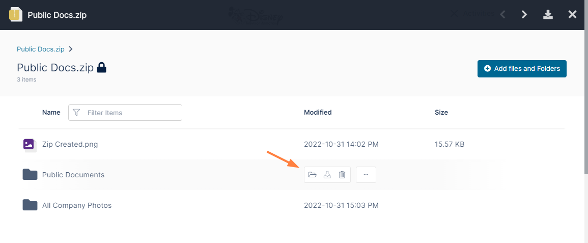 - Click the zip file name, or hover over the zip file and click the Open (Enter) icon.