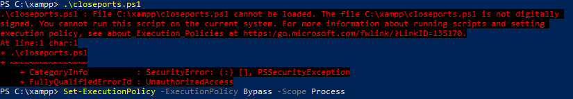 CODE.\closeports.ps1If you get a script security warning, just enable running the script only for this current session using the following command.
